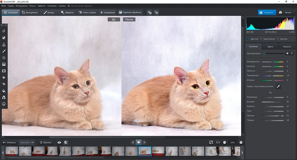- коррекция экспозиции, цвета, резкости, снижения шумов;