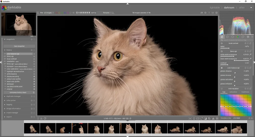 Кроссплатформенная программа с открытым исходным кодом для работы с RAW-фото. Даже интерфейсом она похожа на Adobe Lightroom: аналог модуля Library — Lighttable предоставляет широкие возможности каталогизации, а Darkroom по функциональности очень напоминает Develop. Также для организации съемочного процесса предусмотрена привязка камеры (Tethering).