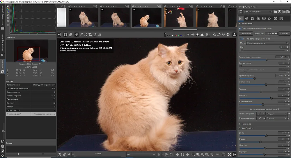 - регулировка экспозиции, контраста, RGB-кривых, уровней, насыщенности в редакторе;