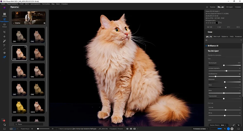 - ИИ-инструменты («Brilliance», «Super Select», «Match») для автоматической коррекции тона, цвета, шумоподавления и автовыделения объектов;