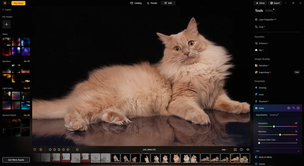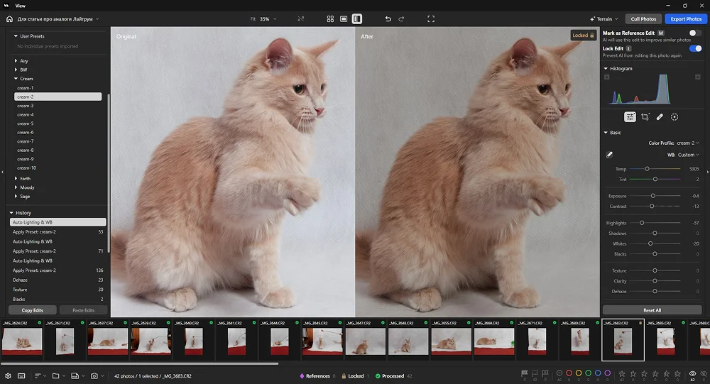 Веб-ориентированный фоторедактор с искусственным интеллектом напоминает по интерфейсу и функциональности Лайтрум, но акцент сделан на AI-редактировании. Сочетание ручных и ИИ-функций упрощает процесс и позволяет полностью контролировать результат. Пользователям следует учитывать, что пока программа представлена в бета-версии — сохраняется высокая вероятность багов.