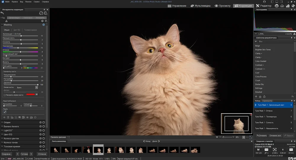 - поддержка корректирующих слоев и маскирования, позволяющая выполнять сложные правки без перехода в другой редактор;