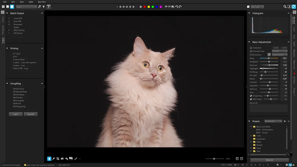 - импорт пользовательскихи предустановленных пресетов из Lightroom;