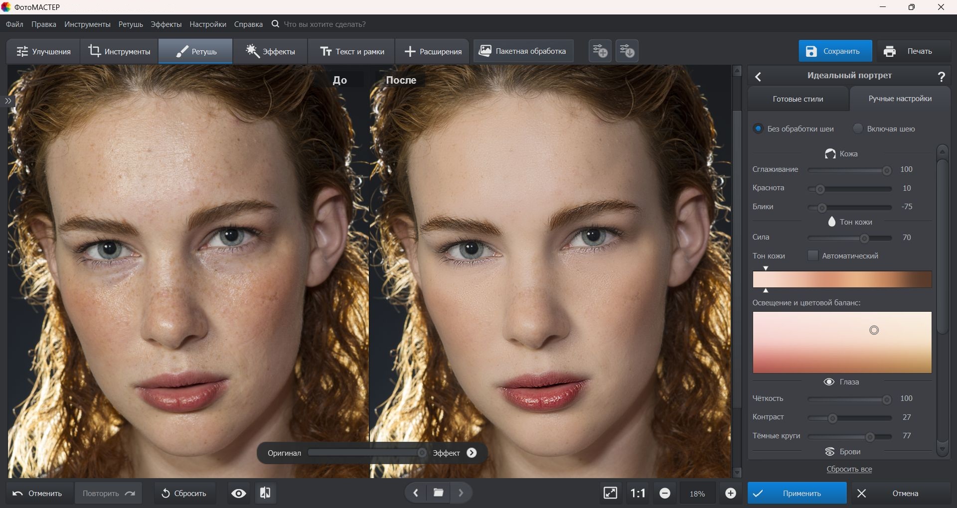 Избавляйтесь от дефектов на портретах и добавляйте макияж! С помощью функции «Идеальный портрет» вы сможете убрать покраснения, блеск и прыщи на лице, добавить загар и сделать акцент на глазах или губах. Используйте готовые пресеты или настраивайте все самостоятельно. Результат вас приятно удивит!
