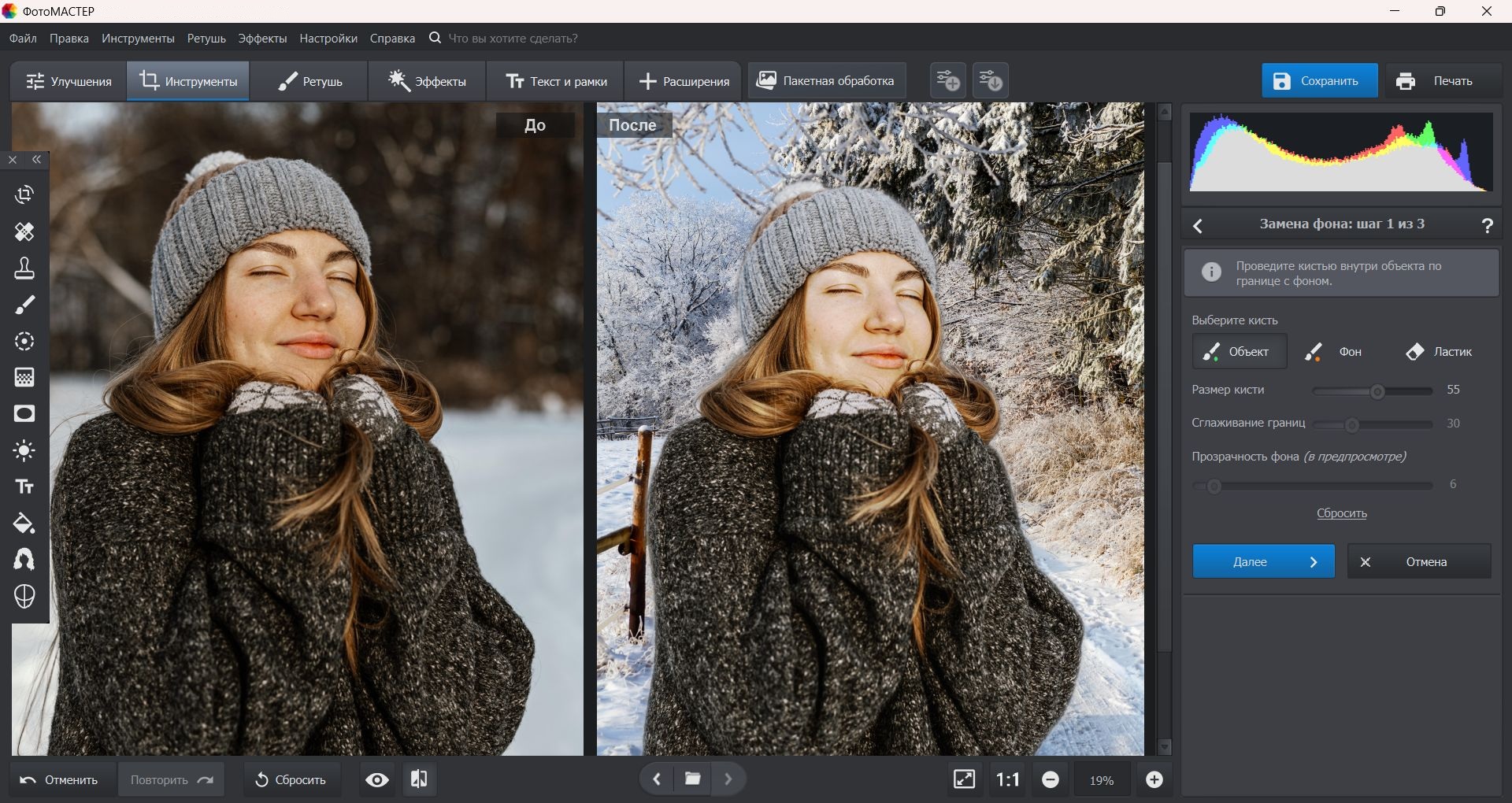 Меняйте скучный фон на фотографиях на интересный буквально за пару кликов мыши! В ФотоМАСТЕРЕ вам не потребуется тратить время на точную обводку, чтобы качественно заменить фон на изображении. Схематично обозначьте нужный элемент и фон, все остальное программа сделает автоматически.