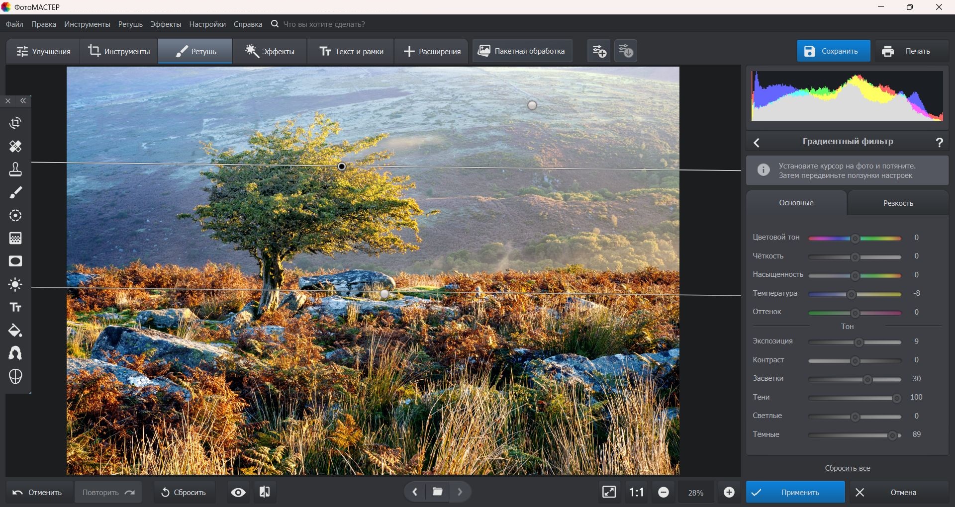 Качественно обработать пейзаж всегда было сложно. Но не теперь! С помощью градиентного фильтра даже новичок сможет правильно и реалистично улучшать пейзажные фотографии. Подчеркивайте цвета, возвращайте утонувшие в потоке дневного света детали, добавляйте размытие! Результат будет выглядеть натурально.