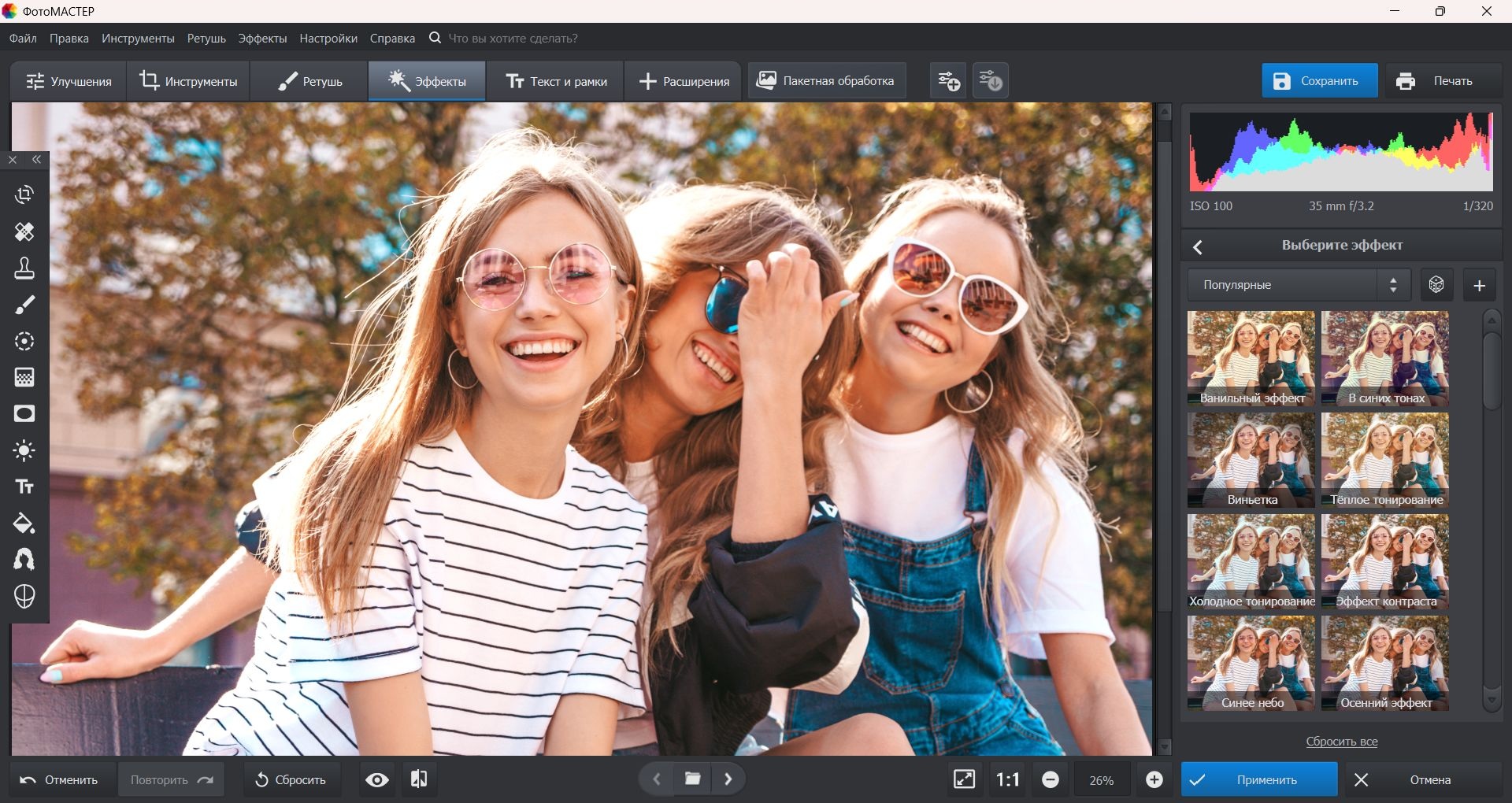 Подчеркивайте настроение снимков с помощью эффектов из каталога программы! В нем вы найдете десятки винтажных и световых фильтров, а также пресетов для красивого тонирования. Обрабатывайте пейзажные фото