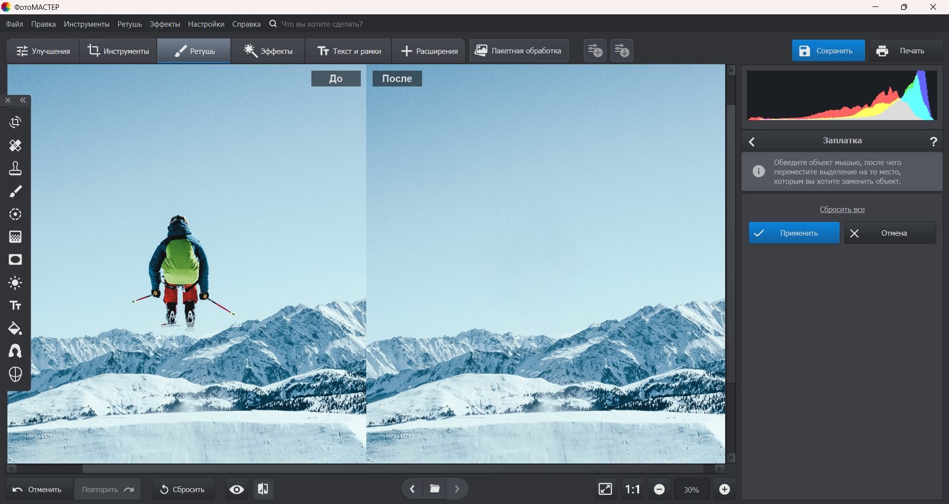 Удаляйте лишние предметы с фото! От случайно попавших в кадр людей, портящих пейзаж проводов и других нежелательных объектов в кадре поможет избавиться штамп или заплатка. Для быстрого устранения мелких дефектов используйте восстанавливающую кисть. Один клик по фото — и от проблемы не останется и следа.