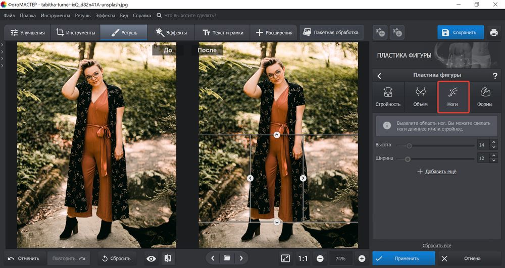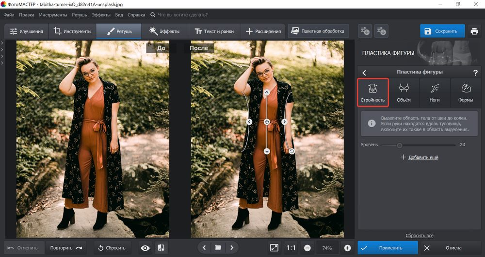 Лучший фоторедактор тела на ПК среди простых вариантов. Его легко освоят новички, а результат будет не отличить от обработки в профессиональных редакторах. Для нашей задачи в редакторе есть специальная функция — «Пластика фигуры». Достаточно настроить область и силу эффекта.