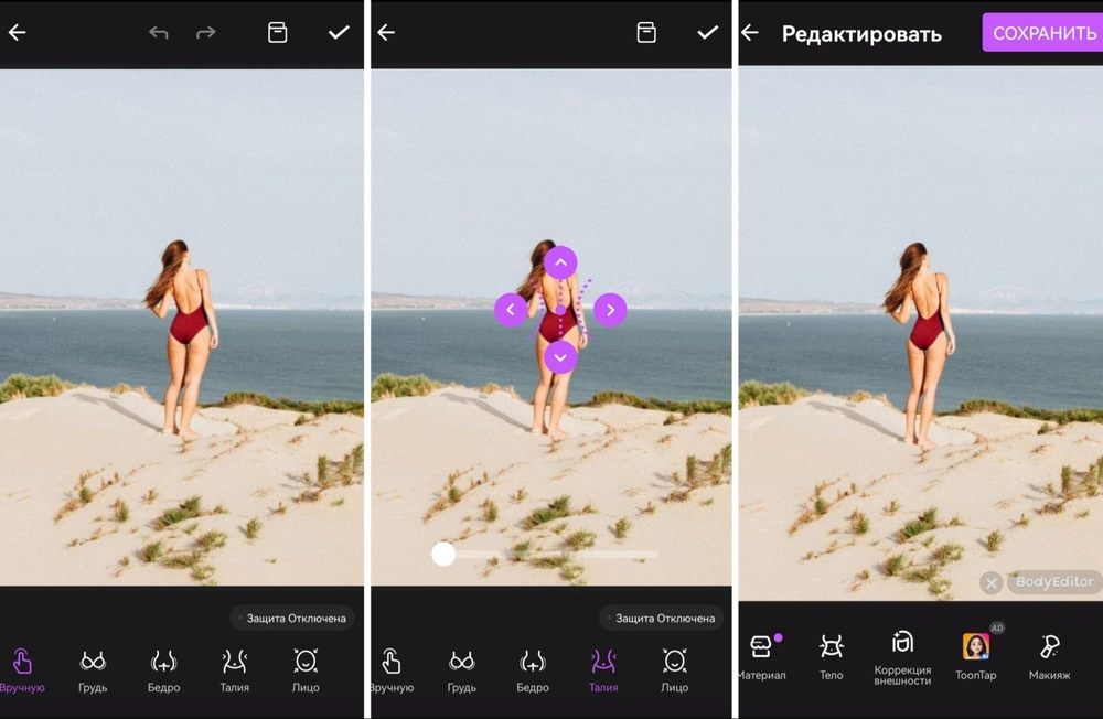 Мобильный редактор тела на фото, который предлагает полуавтоматическую и ручную корректировку. Все функции интуитивно понятные, так что приложение подойдет для простого улучшения снимков.