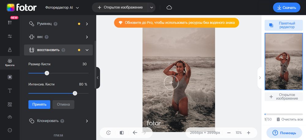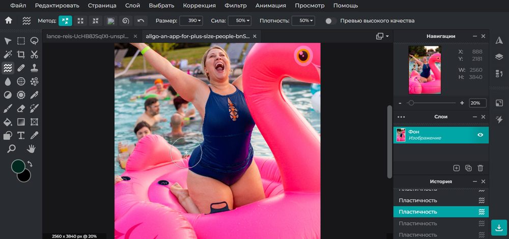 Редактор фигуры на фото с искусственным интеллектом. Подходит для полноценной обработки фотографий, в том числе изменения силуэта и лица. Большинство функций сервиса платные, но для базовой корректировки вполне будет достаточно бесплатных.
