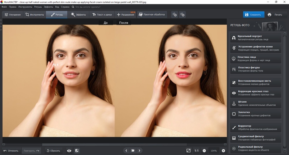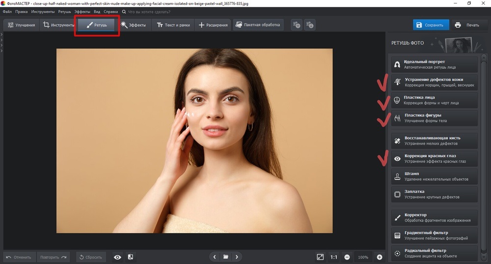 - Используйте средства ретуши для пластики фигуры, разглаживания кожи, удаления морщин, прыщей и других дефектов.