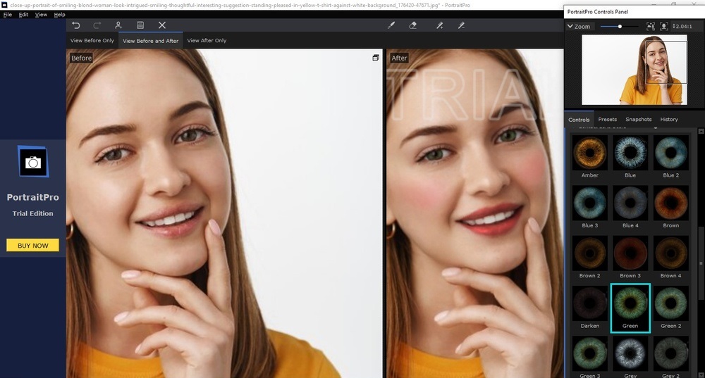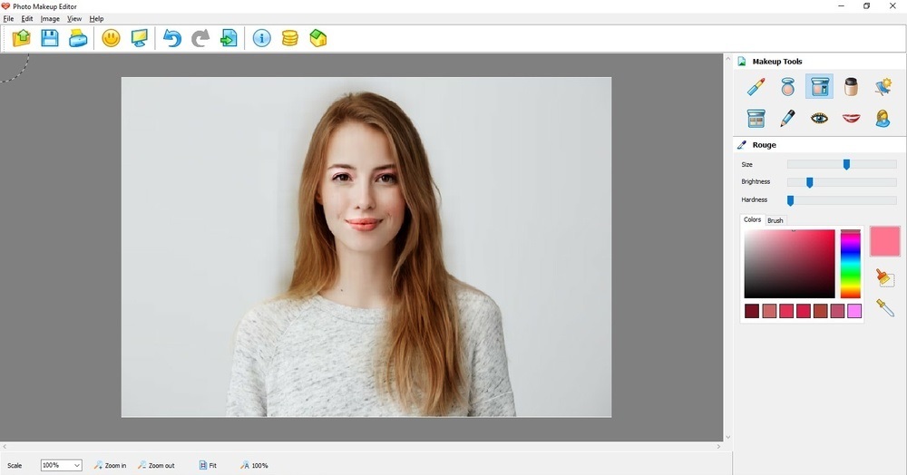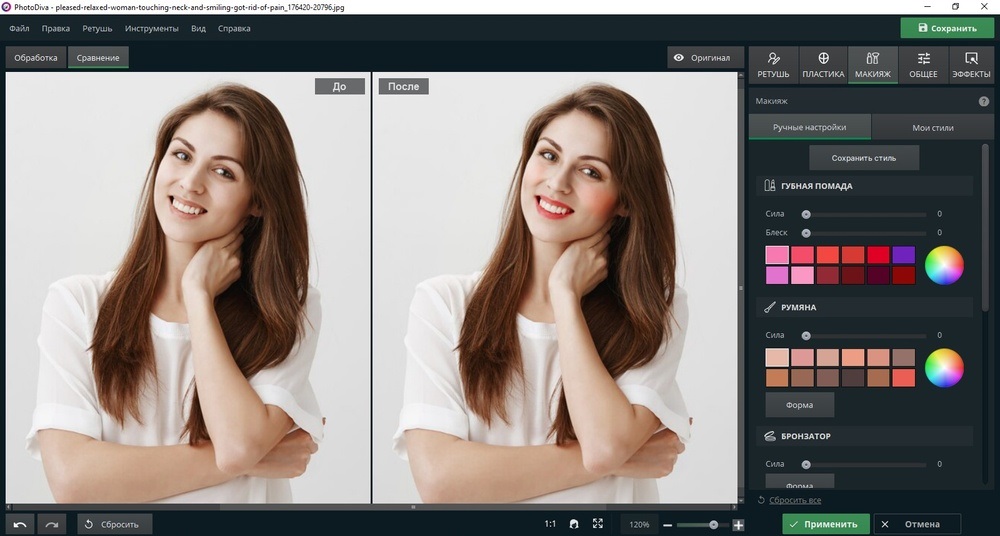 Профессиональный редактор с огромным набором инструментов для ретуши портретов. Виртуальный макияж не обозначен как отдельная опция, однако при наличии опыта и навыков работы в программе нанести тени, подкрасить губы и выровнять тон кожи не составит труда.