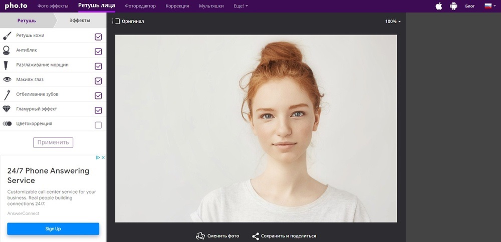 Отличный онлайн-сервис для ретуши лица — здесь легко сделать минимальный макияж глаз и обработать портретный кадр за счет использования эффектных фильтров. Скачивать ничего не требуется, просто перетащите снимок в рабочее поле и выберите подходящий мейк.