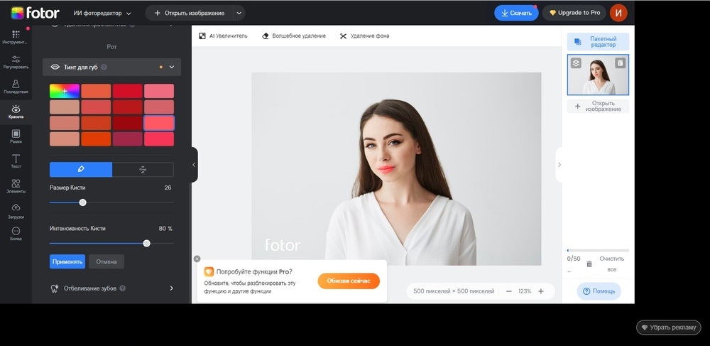 Этот функциональный сервис позволяет превратить обычный портрет в стильный гламурный шедевр. Для виртуального макияжа предназначена вкладка «Красота» — там можно работать не только с косметикой, но и с удалением дефектов в виде морщин, родинок, шрамов.