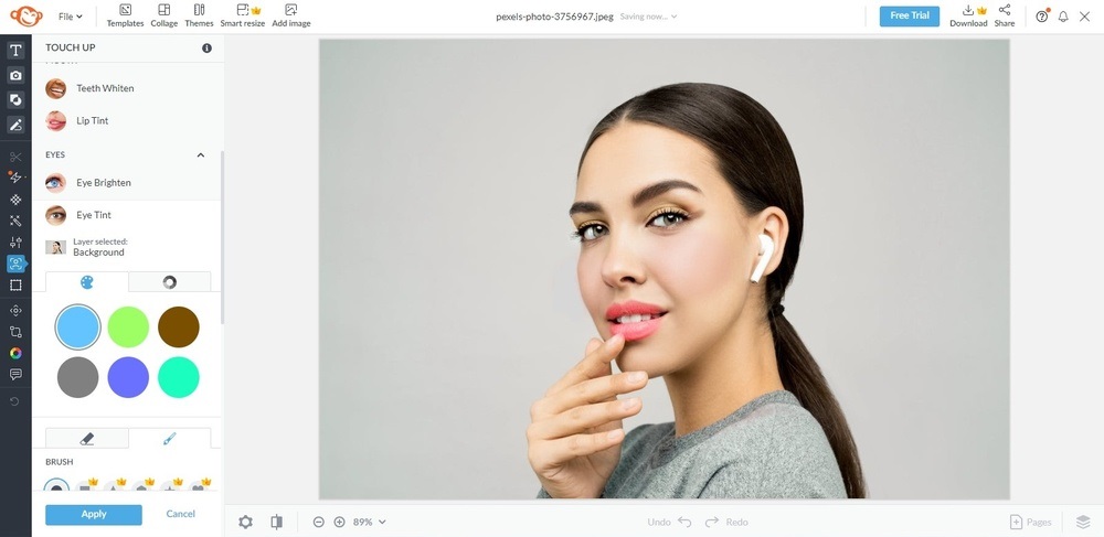 - Слева на панели инструментов нажмите «Touch up». Рядом появится список инструментов для мейкапа: Skin (кожа), Mouth (рот), Eyes (глаза), Rest (остальное).