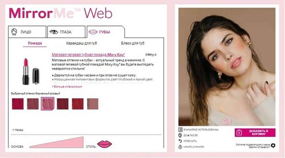 Сервис от компании Mary Kay. Используемую для виртуального мейка косметику можно купить и оценить при нанесении реального макияжа. Создатели приложения стремятся облегчить женщинам выбор косметики, давая возможность посмотреть на себя в разных образах.