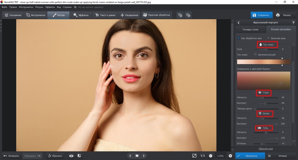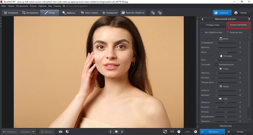 - Чтобы нанести макияж, кликните «Идеальный портрет» → «Ручные настройки».