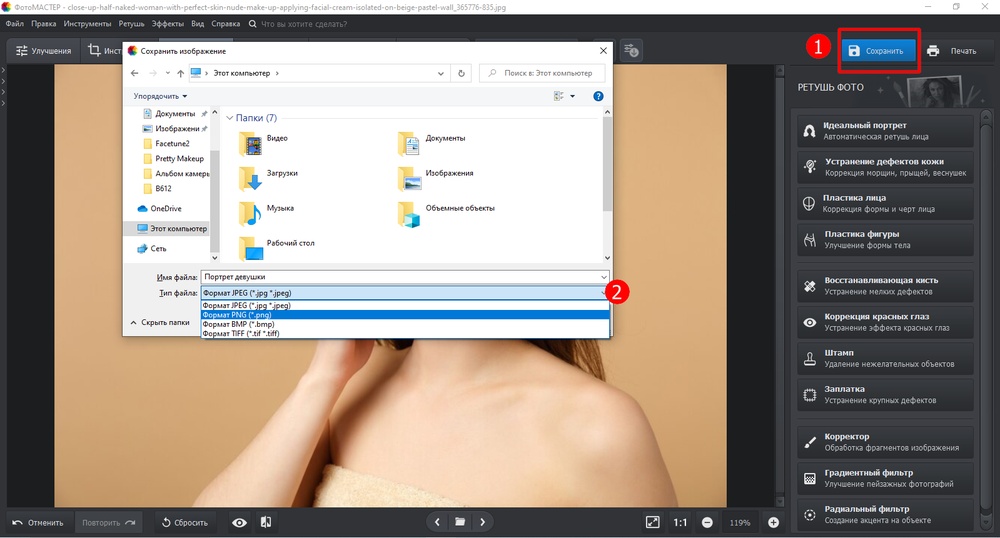 - При желании вы можете продолжить работу над фото: настроить ее экспозицию, контраст, насыщенность, применить эффекты и многое другое. Когда все будет готово, нажмите «Сохранить» и выберите подходящий для вас формат.