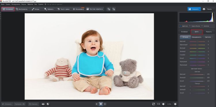 - В разделе «Улучшения» перейдите в «Цвета» и воспользуйтесь бегунками.