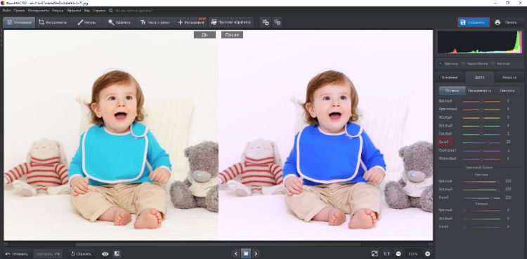 - 🌟 ФотоМАСТЕР — редактор с русским интерфейсом, который позволяет изменить цвет тремя способами: вручную, с помощью ползунков или пресетов. Включает инструменты для улучшения изображения, ретушь портретов и эффекты.