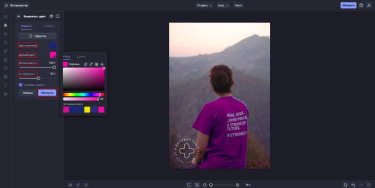 - Слева выберите опцию «Заменить цвет». Используйте палитру для настройки оттенков.