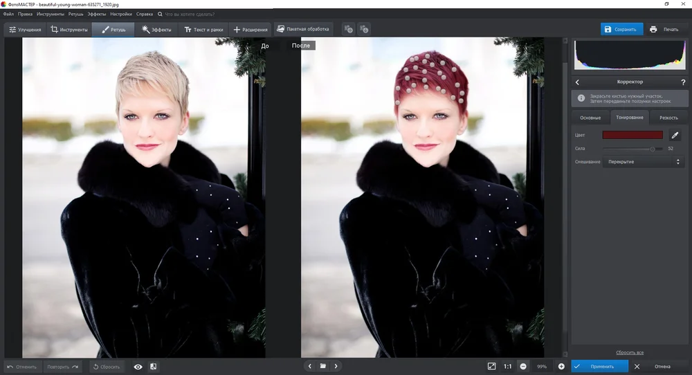 - 🏆 ФотоМАСТЕР — редактор с большим количеством настроек для реалистичного окрашивания без ограничений по оттенку.