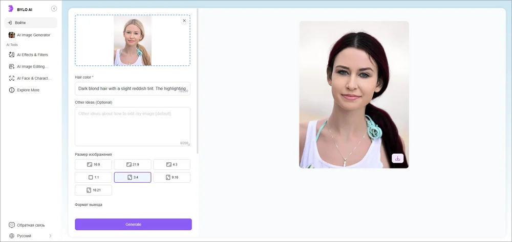 Нейросеть примеряет новый имидж всего за пару кликов. Просто загружайте фото и выбирайте тип тонирования. Кроме преобразователя прически на платформе собрано множество AI-инструментов для реставрации и редактирования фотографии, генерации аватаров, удаления фона.