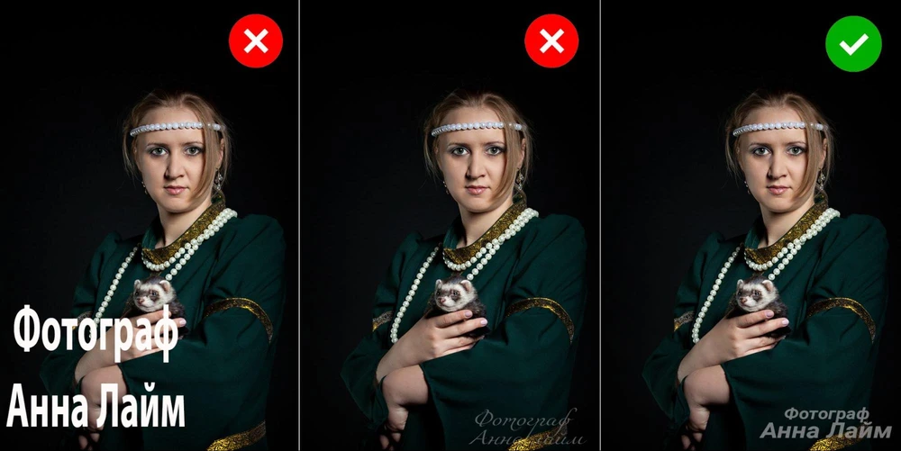 Вотермарк нужно расположить так, чтобы его нельзя было безболезненно удалить кадрированием. Но при этом он не должен портить эстетическое впечатление или закрывать важные детали. Оптимальное решение — поместить защиту в одном из углов. Можно развернуть надпись по диагонали или сдвинуть так, чтобы при попытке кадрирования основной элемент тоже попадал в зону обрезки.