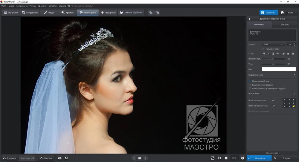 - Введите в текстовое поле свои данные, подберите стиль и размер шрифта, настройте уровень прозрачности и угол наклона. Выберите тип заполнения. Для одиночного элемента укажите область и величину отступа от края.