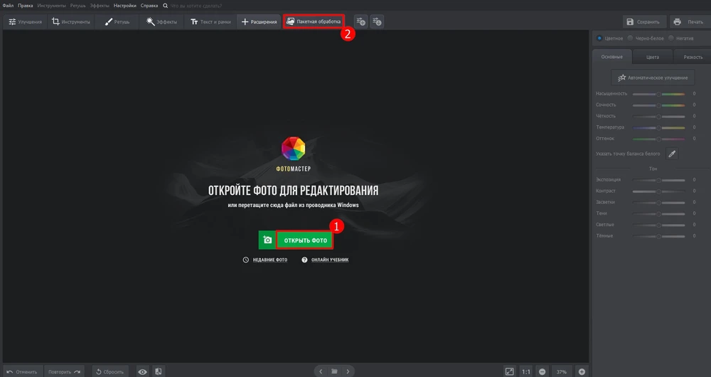 - После запуска программы откройте фотографию во вкладке «Editor» или перейдите в раздел «Batch» для массовой обработки.
