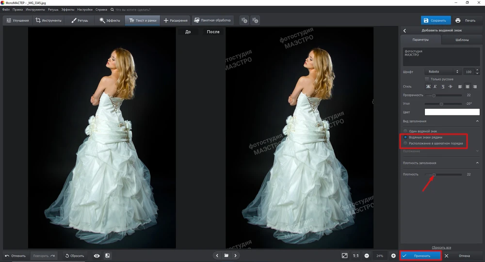 - Если выбрали множественные вотермарки, настройте плотность заполнения. Нажмите «Применить», чтобы сохранить изменения.