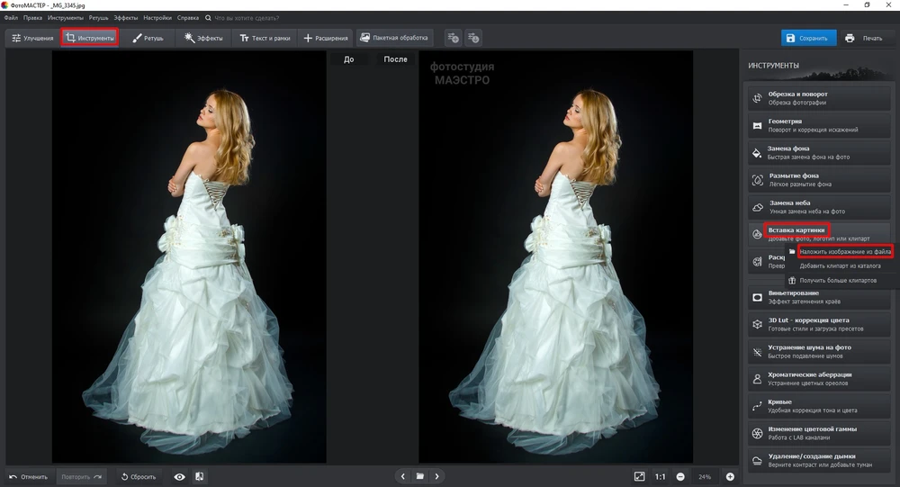 - Для добавления лого перейдите в «Инструменты». Кликните на «Вставка картинок» и выберите в появившемся меню «Наложить изображение из файла».