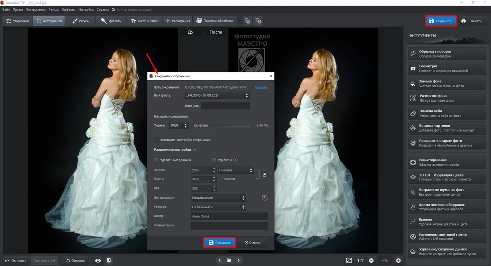 - Щелкните на «Сохранить», пропишите формат, затем экспортируйте снимки.