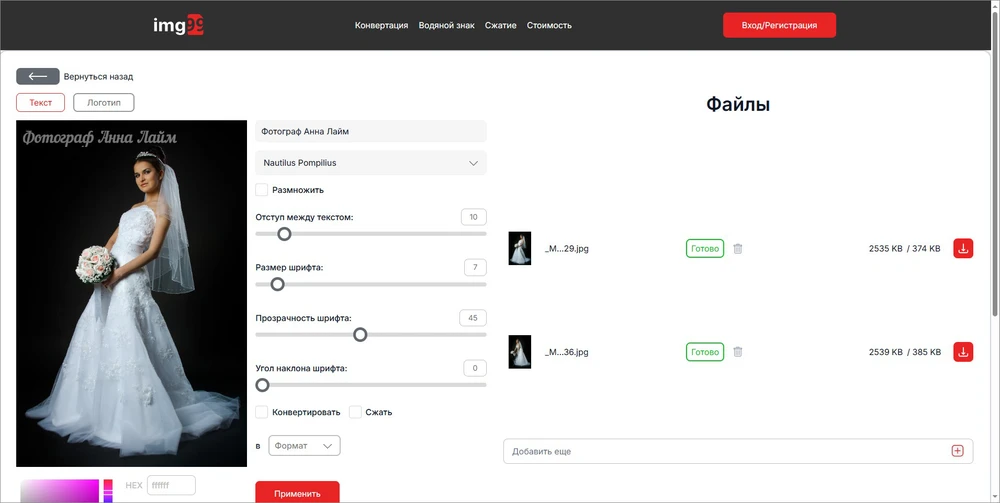 Отечественный сервис поможет защитить ваш контент быстро и бесплатно. В его арсенале — два десятка шрифтов, все — с поддержкой кириллицы. Позволяет наносить символы в выбранной области и по всему полю. Предлагает расширенные настройки надписей. Из недостатков стоит отметить обилие рекламных баннеров, замедляющих обработку.