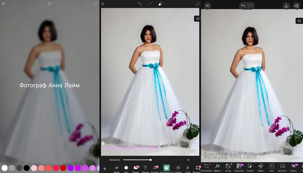 - Нажмите на кнопку с буквой «А». Введите имя или название бренда, значок копирайта. Перетащите рамку с подписью в желаемое место, поменяйте шрифт, прозрачность, заливку.