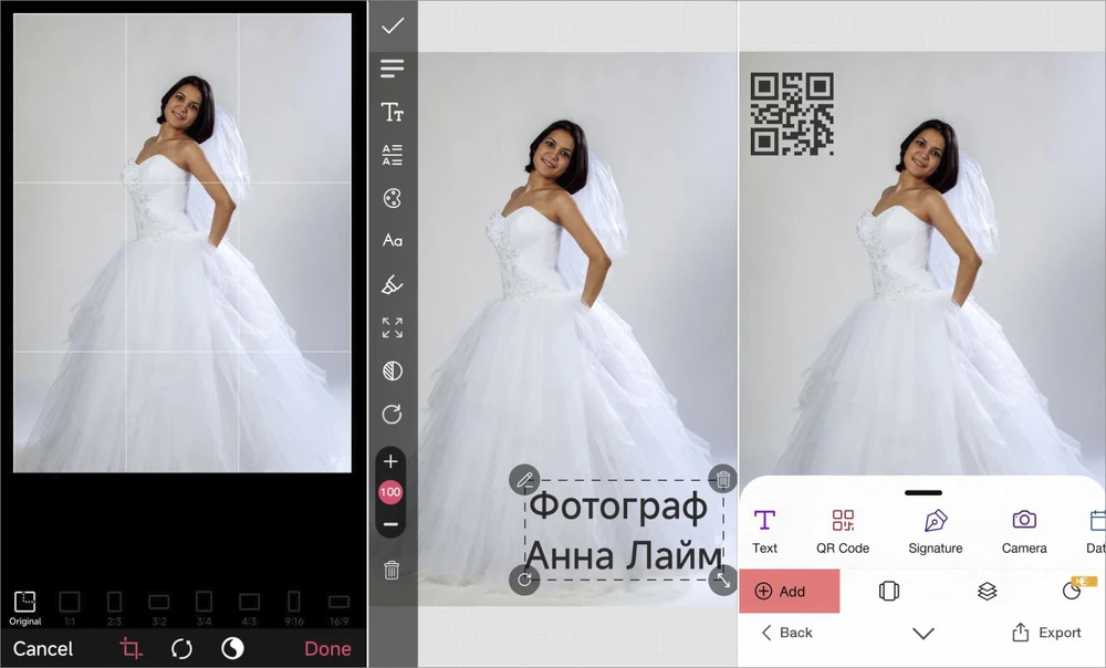 Разработчики предоставили пользователям все возможности, чтобы заявить о себе и предупредить кражу контента. Создавайте подписи с помощью десятков стильных шрифтов, добавьте собственный лого. Также вы сможете адаптировать свой контент под разные площадки — предлагаются предустановленные профили с разным соотношением сторон.