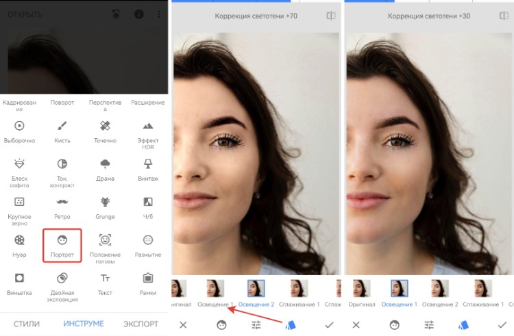 - Чтобы результат получится более реалистичным, а фотография — привлекательной, откройте «Портрет». Выберите подходящий пресет или сделайте коррекцию светотени вручную. Там же можно разгладить оставшиеся неровности на коже.