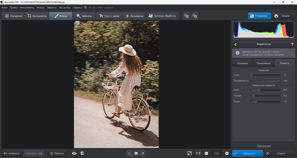 - Попробуйте сделать четче отдельный объект. Если нужно добавить четкость краям или конкретному элементу, откройте «Ретушь» → «Корректор». В меню «Основные» настройте масштаб кисти. Закрасьте фрагмент, затем перейдите в соседнюю вкладку «Резкость» и отрегулируйте параметры. Их значения можно изменить в любой момент. Для этого щелкните по маркеру выделения (белый кружок) и передвиньте ползунки. Когда закончите редактирование, кликните «Применить». Так вы сможете создать эффект размытия в движении и сделать акцент на модели.