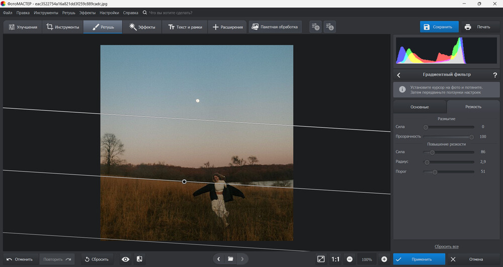 - Плавно повысьте резкость. Выборочно сделать резкой широкую область снимка можно с помощью «Градиентного фильтра». Опция находится в меню «Ретушь». Выделите место, которое надо изменить, а затем подберите параметры во вкладке справа. Здесь, как и в прошлых случаях, вы можете отрегулировать «Силу», «Радиус» и «Порог».