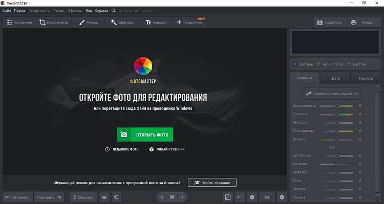 Для начала скачайте фоторедактор и установите его на ПК. Запустите софт двойным кликом по ярлыку на рабочем столе и добавьте неудачное изображение. Для этого нажмите «Открыть фото».