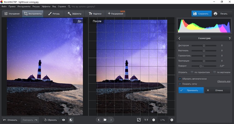Откройте вкладку «Инструменты» и найдите пункт «Геометрия». Здесь вы сможете исправить любые типы искажений, будь то «завалившийся» горизонт, дисторсия или неправильный поворот. Для более удобной работы вы можете включить разлиновку, по которой будете отслеживать результат. Для этого справа отметьте галочкой пункт «Показать сетку». После этого начинайте регулировать изображения, передвигая слайдеры справа. Затем нажмите «Применить».