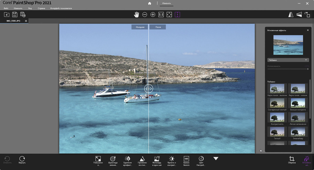 - Автоматическая коррекция освещения, цвета и экспозиции в один клик
