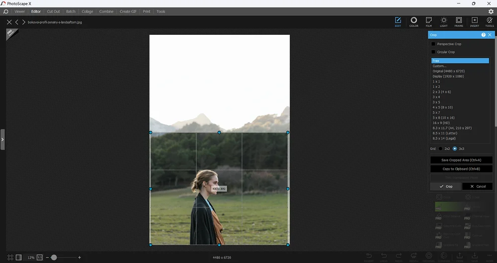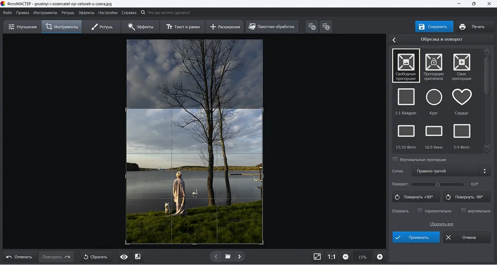 Программа, ориентированная на широкого пользователя. Ее главное преимущество — интуитивный интерфейс и простота использования. Софт поддерживает все распространенные форматы файлов, включая RAW. Изменить размер картинки здесь просто. Есть как ручная обрезка, так и множество готовых шаблонов с популярными соотношениями сторон. Например, 10х15 см для фотопечати, 7:5 для публикации во ВКонтакте или 16:9 для обоев на iPhone.