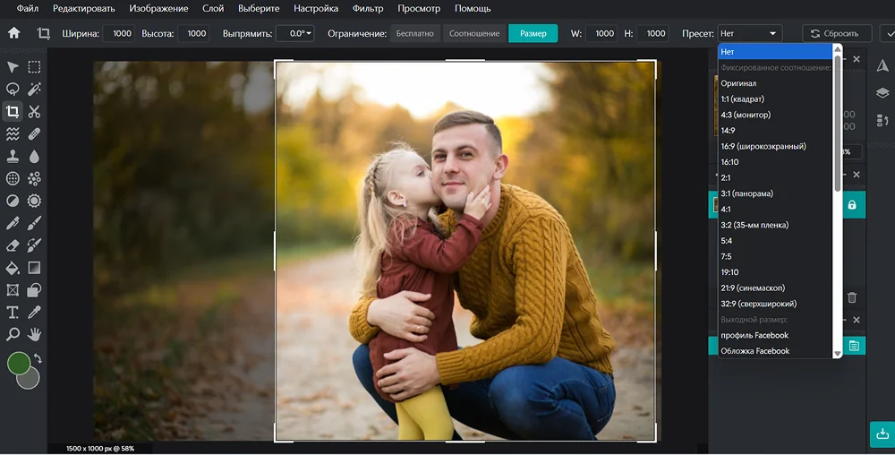 - Обрезка с фиксированным соотношением сторон и произвольным (когда корректируется только одна сторона: ширина или высота).