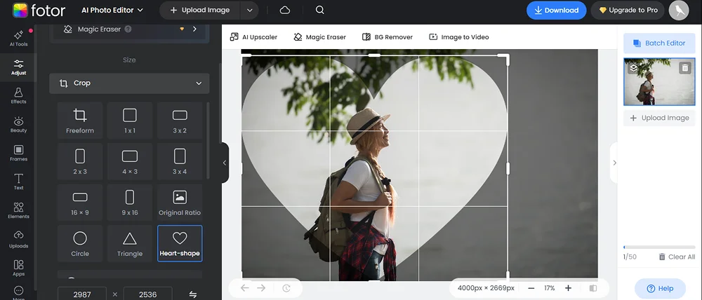 Программа обрезки фото, работающая онлайн. Предлагает стандартные и продвинутые опции коррекции фотографий. Имеет много встроенных ИИ-фильтров, с помощью которых выполняется огромный спектр задач. Например, ретушь кожи, апскейлинг, экстракция заднего плана и др.