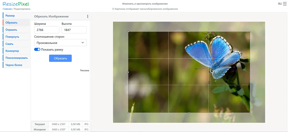 Бесплатный обрезатель, который также справляется с другими техническими правками: изменением размера, компрессией, зеркальным отображением, конвертацией, переводом в ЧБ изображение или оттенки серого.