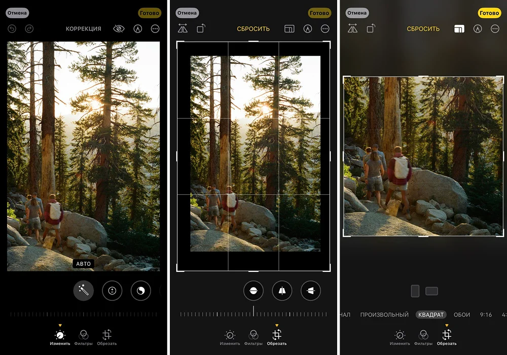 Это встроенное приложение для просмотра фотографий на айфоне. Кадрирование в нем выполняется по аналогии с остальными программами: при помощи свободной подгонки или применения пресетов. Сохраняются оба варианта: исходное фото и уже кропнутое.