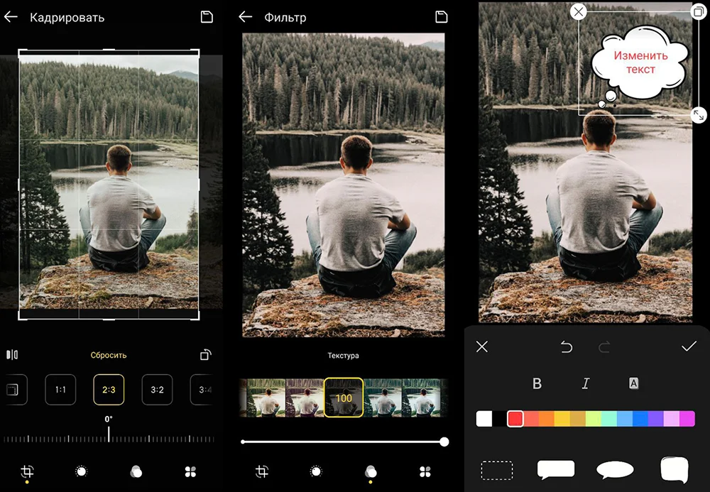 Владельцы смартфонов на платформе Android тоже могут обойтись без скачивания стороннего софта. Достаточно открыть фото и внизу появится панель с инструментами для быстрых правок. Так можно кадрировать снимок, наложить немудреный фильтр, сделать надпись.