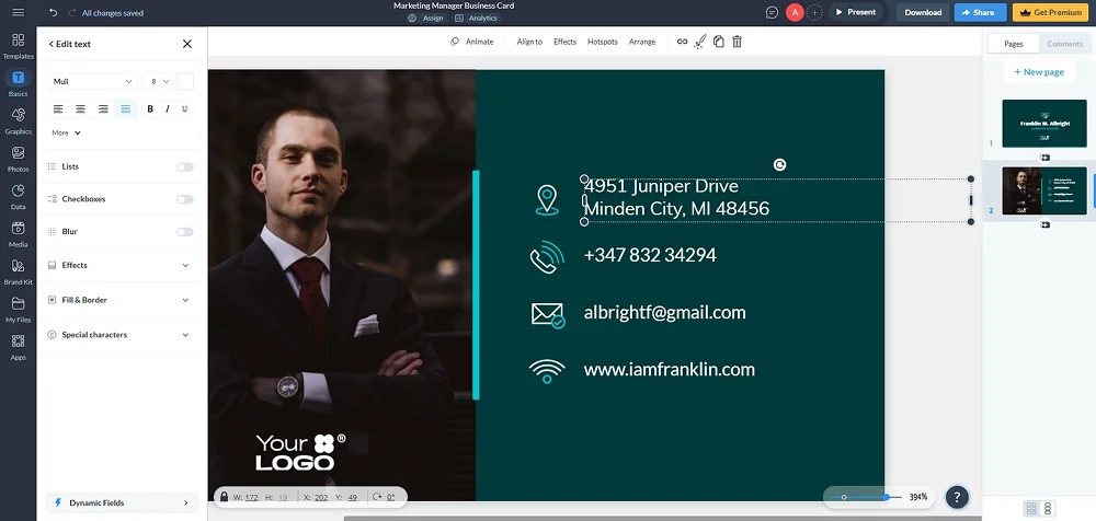 Мобильный редактор бизнес-карт, который по функциональности мало уступает десктопным аналогам. Вы можете создавать дизайны с нуля или по образцу. Доступно сохранение дизайна визиток в графическом формате и в виде PDF-файла.